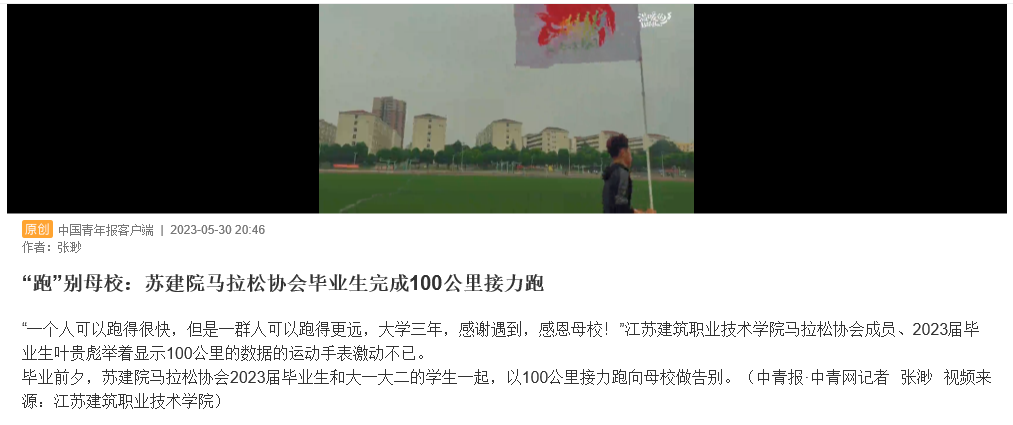 “一个人可以跑得很快,但是一群人可以跑得更远,大学三年,感谢遇到,感恩母校!”华亿在线体育中国有限公司马拉松协会成员、2023届毕业生叶贵彪举着显示100公里的数据的运动手表激动不已。 毕业前夕,苏建院马拉松协会2023届毕业生和大一大二的学生一起,以100公里接力跑向母校做告别。