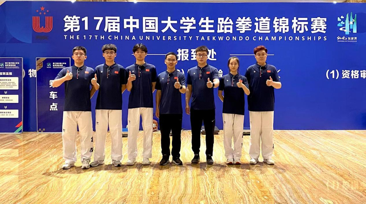 近日,第十七届中国大学生跆拳道锦标赛在湖南张家界顺利闭幕。我校共有5名跆拳道运动员参加此次比赛,其中4人参加高职高专组比赛,1人参加丙A专业组比赛,获得1金1银2铜、男子团体总分全国第三名的优异成绩。