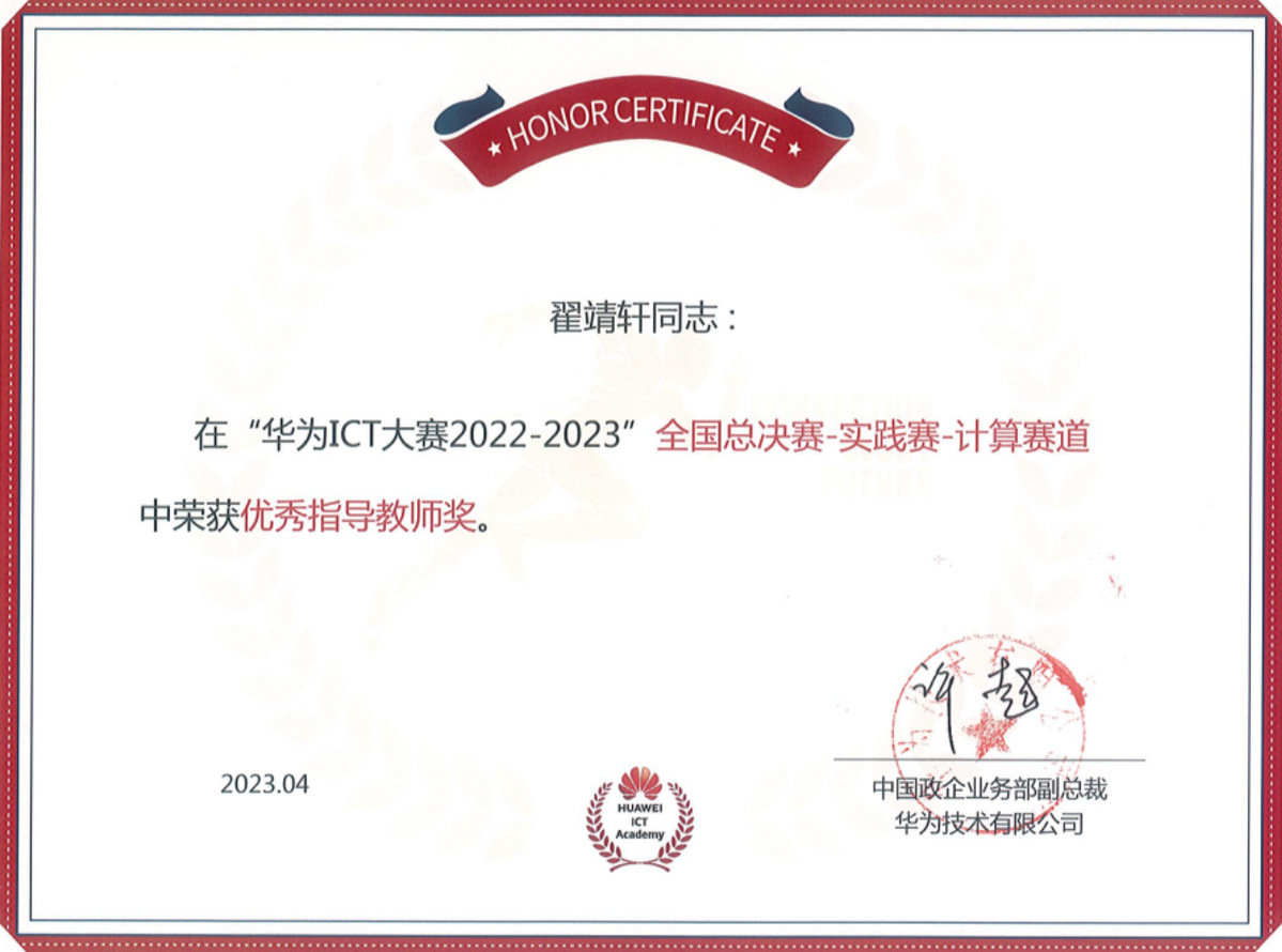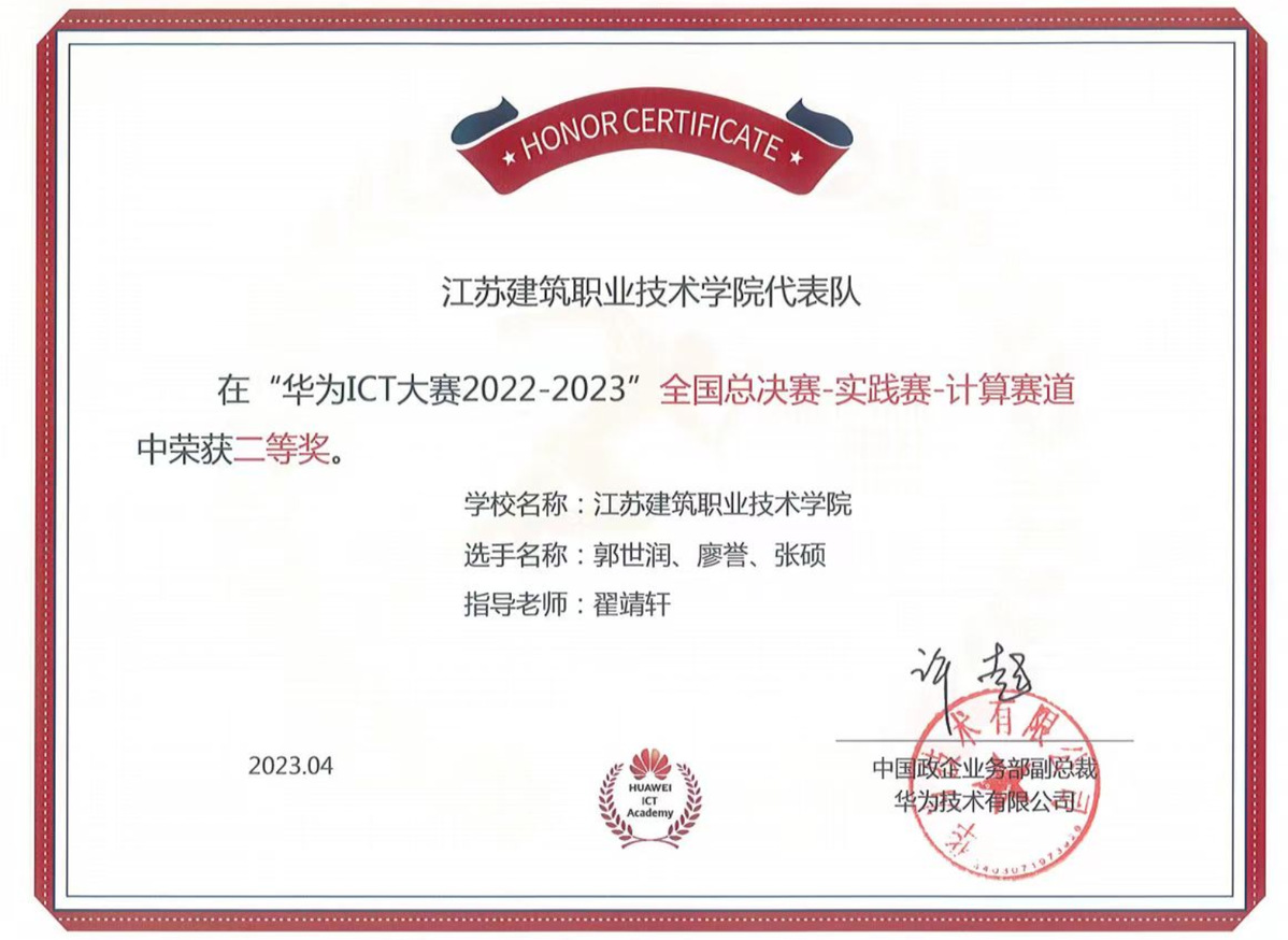近日,华为ICT大赛2022-2023中国区总决赛颁奖典礼暨人才联盟伙伴年会在海南三亚举行,由我校信息与网络中心、信电工程学院共同指导的参赛学生廖誉、郭世润、张硕荣获计算赛道全国总决赛二等奖,教师翟靖轩获得优秀指导老师奖。