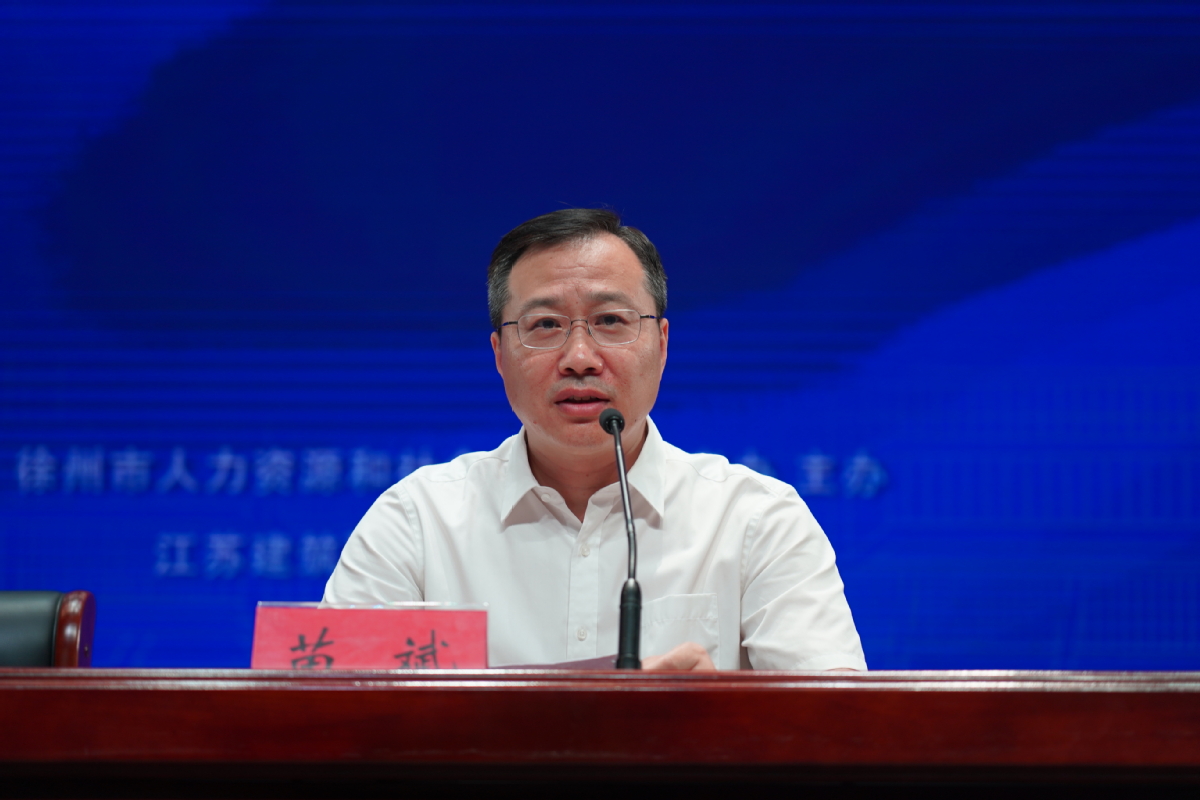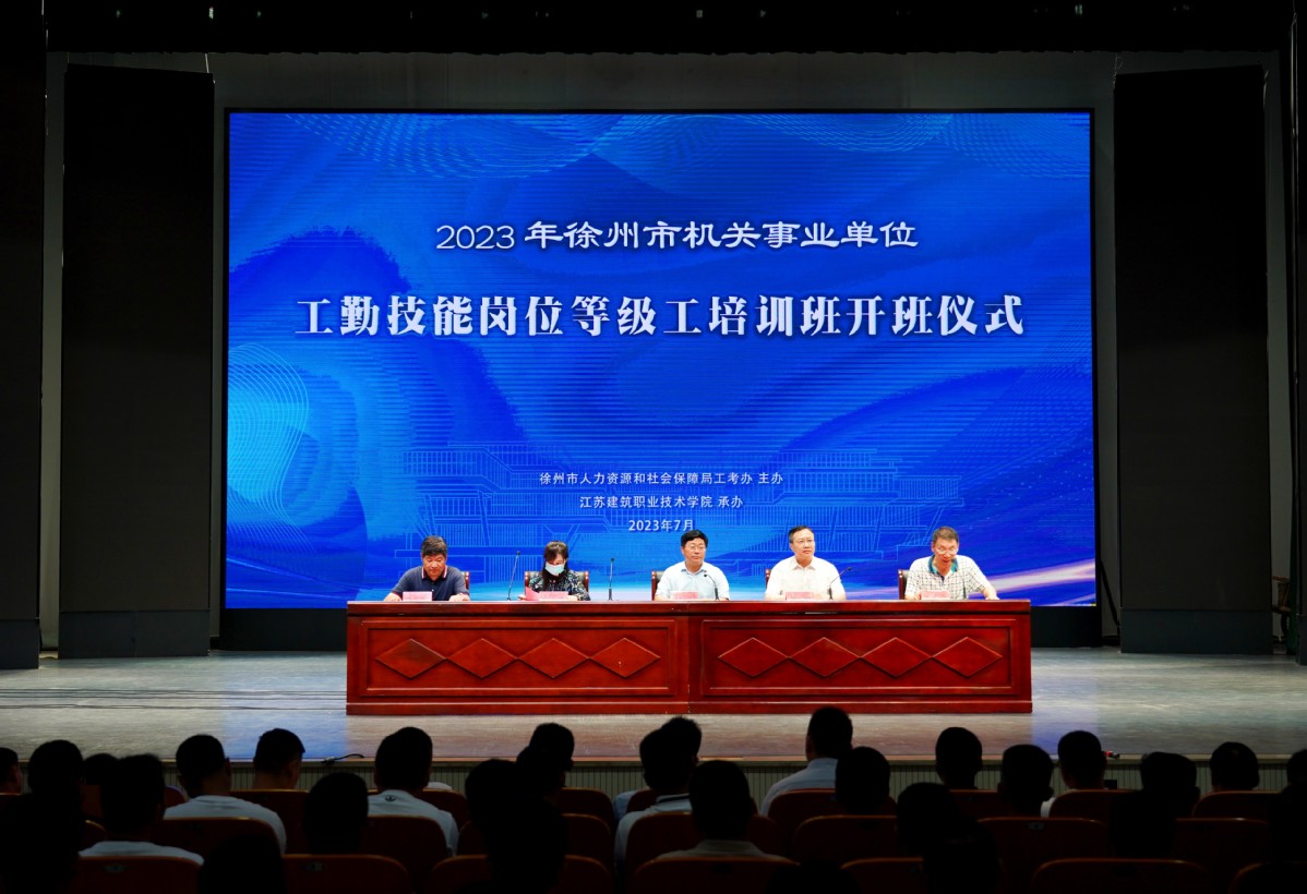 7月7日,2023年徐州市机关事业单位工勤技能岗位等级工培训开班仪式在我校会堂举行,党委副书记、校长沈士德,徐州市人力资源和社会保障局副局长苗斌、工考办主任陈苏南及校实验实训管理处相关负责人出席开班仪式。