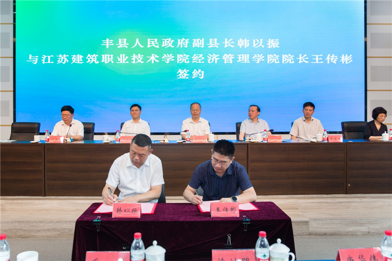 丰县人民政府副县长韩以振与江苏建院经济管理学院院长王传彬按照“加强协作、优势互补、互相支持、互惠共赢”的原则签署校地合作发展协议书,约定校地协同推进乡村振兴战略规划,加速科技创新与成果转化,积极助力丰县打造县域经济新高地的发展战略。