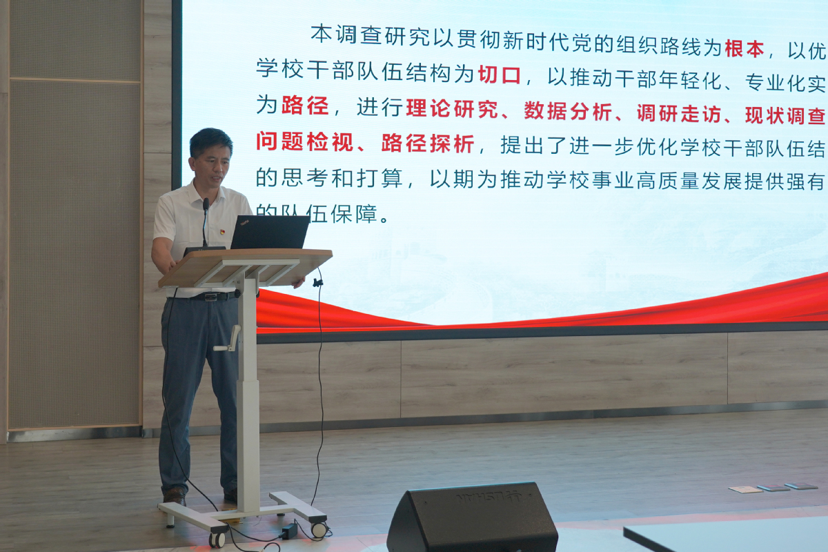 会上,朱东风首先就学校干部队伍建设情况调研作主题发言,以《面向年轻化、专业化 进一步优化干部队伍结构》为题,从调研课题的提出、调研工作的开展、调研结果与成效、工作改进与思考四个方面为与会同志详细解读了调研报告。朱东风指出,学校第三次党代会擘画了“全国一流智能建造特色鲜明的职业本科院校”的美好蓝图,必须要以一支优秀的干部队伍来推动奋斗目标的实现。当前,学校干部队伍总体上逐渐趋于年轻,但还有进一步深化的空间,在一体化选拔考察培养基础上的常态化工作机制还不够健全。结合调研具体情况,针对下一步工作打算,朱东风表示,要优化干部梯队结构、锤炼干部能力素质、用好离任干部队伍、从严从实管理干部,切实提高干部的政治素质、业务能力和担当意识。