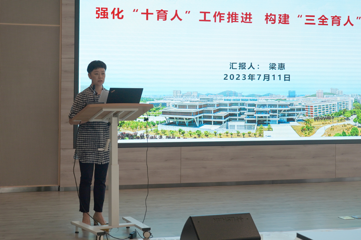 党委副书记梁惠就构建我校“三全育人”新格局调研作主题发言。她表示,学校紧紧围绕“培养什么人、怎样培养人、为谁培养人”这一根本性问题,以“十育人”体系建设为主要内容,以思想政治工作精品项目建设为抓手,注重顶层设计,制定实施方案,形成了内容完善、标准先进、运行科学、保障有力、成效显著的“三全育人”工作新格局。