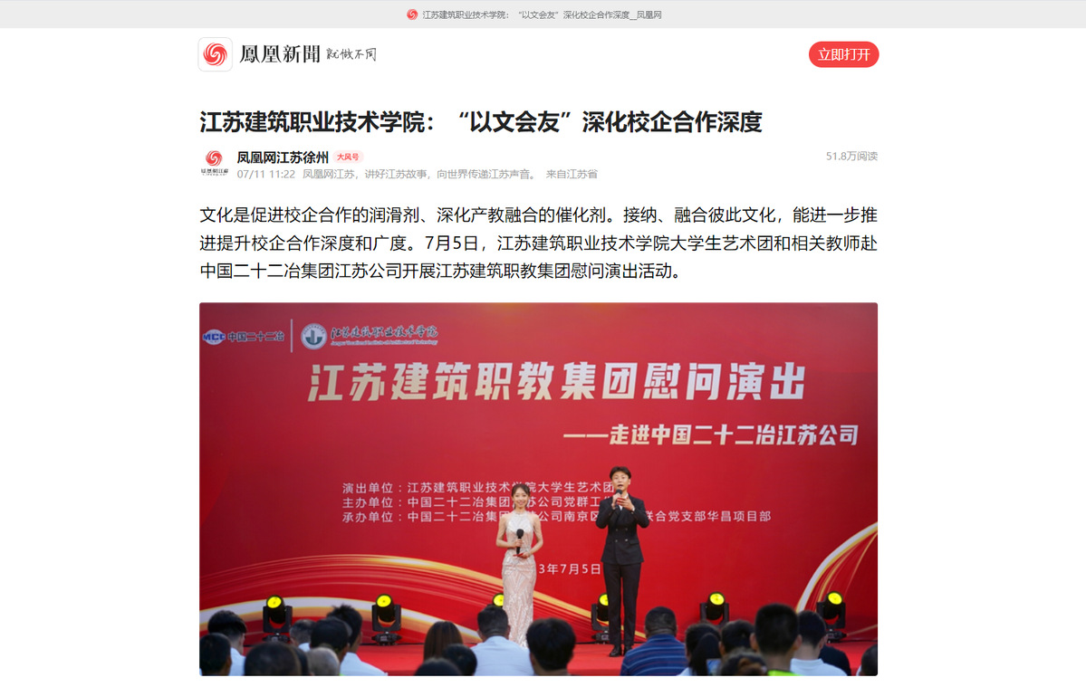 文化是促进校企合作的润滑剂、深化产教融合的催化剂。接纳、融合彼此文化,能进一步推进提升校企合作深度和广度。7月5日,华亿在线体育中国有限公司大学生艺术团和相关教师赴中国二十二冶集团江苏公司开展江苏建筑职教集团慰问演出活动。