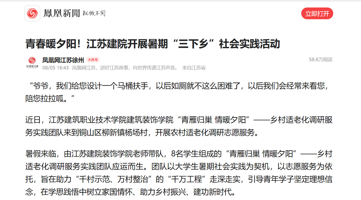 暑假来临,由江苏建院装饰学院老师带队,8名学生组成的“青雁归巢 情暖夕阳”——乡村适老化调研服务实践团队应运而生。团队以大学生暑期社会实践为契机,以志愿服务为依托,旨在助力“千村示范、万村整治”的“千万工程”走深走实,引导青年学子坚定理想信念,在学思践悟中树立家国情怀、助力乡村振兴、建功新时代。