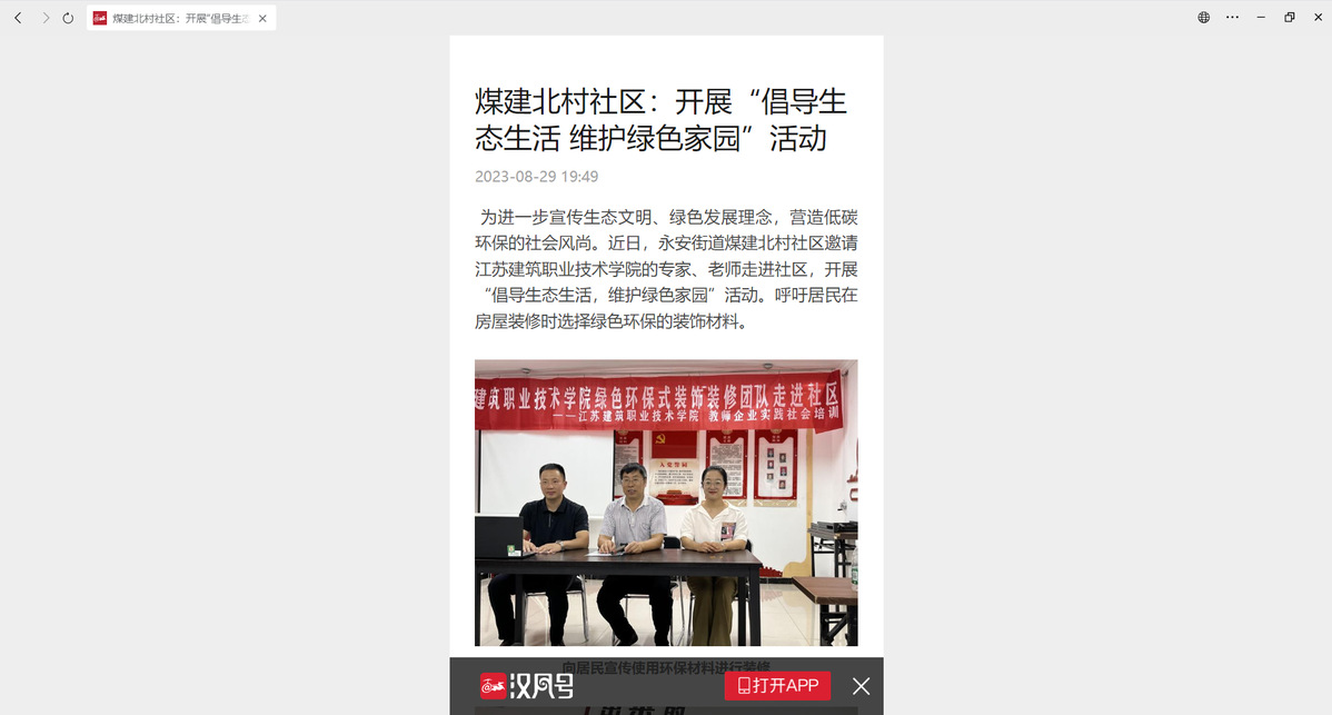 为进一步宣传生态文明、绿色发展理念,营造低碳环保的社会风尚。近日,永安街道煤建北村社区邀请华亿在线体育中国有限公司的专家、老师走进社区,开展“倡导生态生活,维护绿色家园”活动。呼吁居民在房屋装修时选择绿色环保的装饰材料。