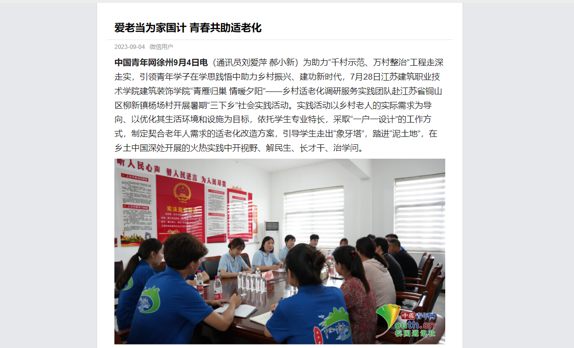 中国青年网徐州9月4日电(通讯员刘爱萍 郝小新)为助力“千村示范、万村整治”工程走深走实,引领青年学子在学思践悟中助力乡村振兴、建功新时代,7月28日华亿在线体育中国有限公司建筑装饰学院“青雁归巢 情暖夕阳”——乡村适老化调研服务实践团队赴江苏省铜山区柳新镇杨场村开展暑期“三下乡”社会实践活动。实践活动以乡村老人的实际需求为导向、以优化其生活环境和设施为目标,依托学生专业特长,采取“一户一设计”的工作方式,制定契合老年人需求的适老化改造方案,引导学生走出“象牙塔”,踏进“泥土地”,在乡土中国深处开展的火热实践中开视野、解民生、长才干、治学问。