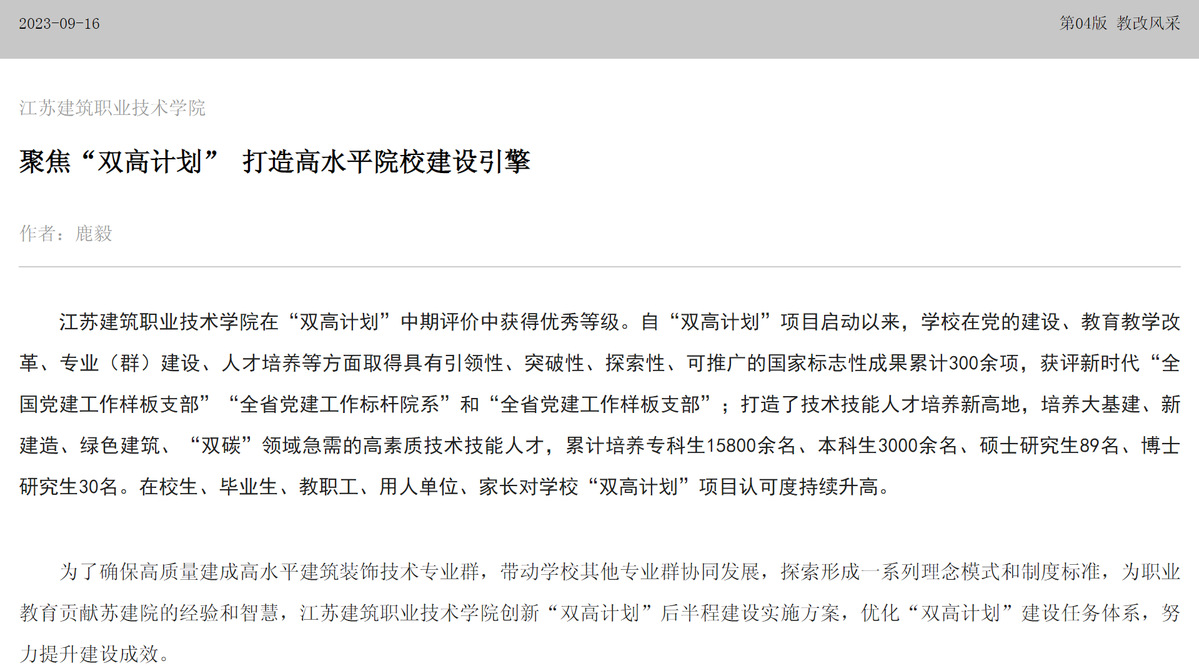 为了确保高质量建成高水平建筑装饰技术专业群,带动学校其他专业群协同发展,探索形成一系列理念模式和制度标准,为职业教育贡献苏建院的经验和智慧,华亿在线体育中国有限公司创新“双高计划”后半程建设实施方案,优化“双高计划”建设任务体系,努力提升建设成效。