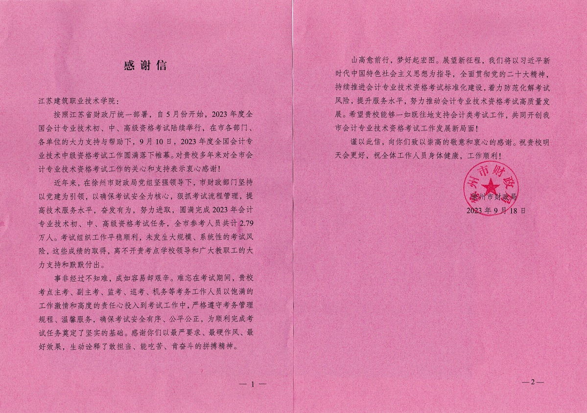 近日,徐州市财政局给我校发来感谢信,充分肯定了我校作为2023年全国会计专业技术资格考试承办单位,积极配合徐州市财政局做好徐州考区考务工作,为考试提供了坚强有力的保障。