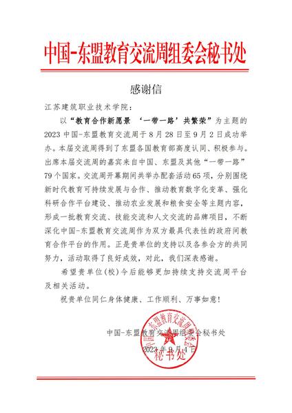 近日,中国-东盟教育交流周组委会秘书处给我校发来感谢信,对我校和贵州建设职业技术学院在2023年8月中国-东盟教育交流周期间牵头发起成立“中国东盟建筑职业教育联盟”并举办首届“中国-东盟建筑职业教育高质量发展论坛”表示感谢,希望我校今后能够更加持续支持交流周平台及相关活动。