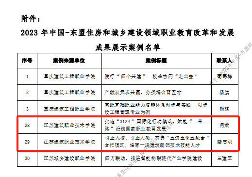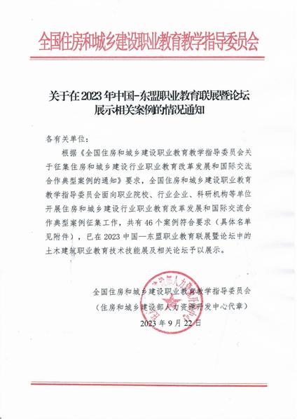 此外,全国住房和城乡建设职业教育教学指导委员会公布了《2023 年中国-东盟住房和城乡建设领域职业教育改革和发展成果展示案例名单》,我校国际交流处与建筑装饰学院选送的案例成功入选并在展示期间得到与会者好评。