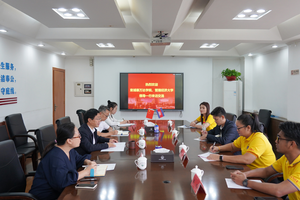 10月10日上午,柬埔寨万达学院副校长琳娜及管理经济大学外联部部长段天民等一行4人来我校交流访问。校长沈士德及国际合作与交流处的相关同志在行政楼第一会议室接待来访客人。