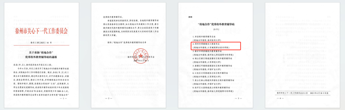 校外教育辅导站是关工委加强对青少年思想道德建设,提高学生综合素质的重要载体,是校内教育的有效延伸与拓展。近年来,我校关工委协同建筑建造学院关工委与邳州市关工委积极开展校地合作,构建牵手育人平台,从单一的物质帮扶到多元化、多层次的共建,合作已取得显著成效。