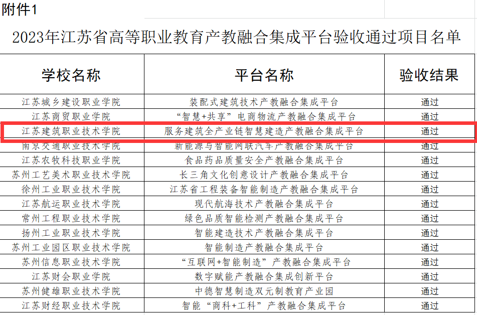 近日,省教育厅公布了2023年江苏省高等职业教育产教融合集成平台建设项目验收结果,我校服务建筑全产业链智慧建造产教融合集成平台项目顺利通过验收。此次省高等职业教育产教融合集成平台项目验收通过共计46项。