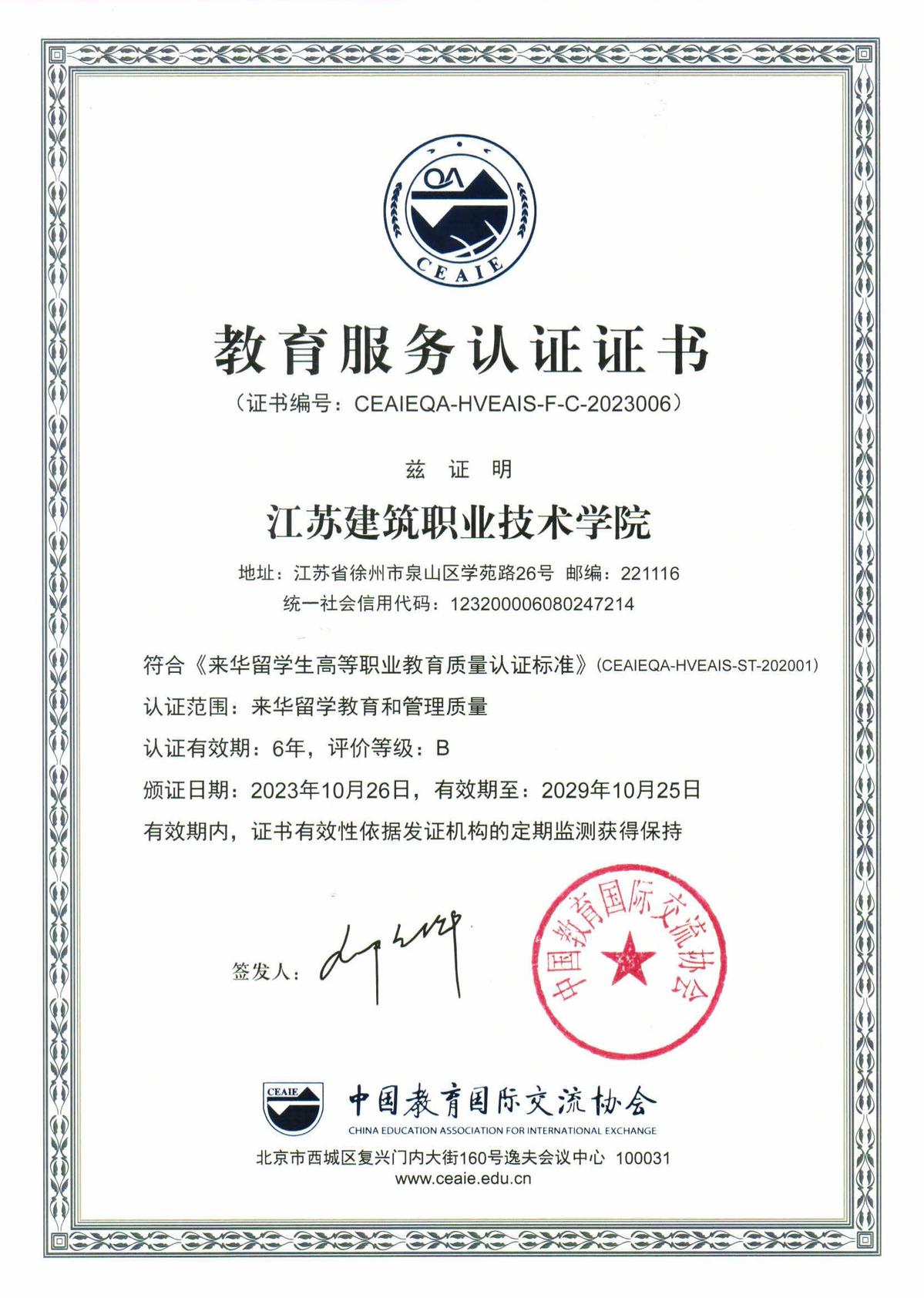 自认证启动以来,我校精心组织、积极申报,通过上报材料、专家初评、自评自改、现场审查和专家意见反馈等环节,中国教育国际交流协会采纳专家组确定我校评价等级为B级等次,认证有效期为6年。