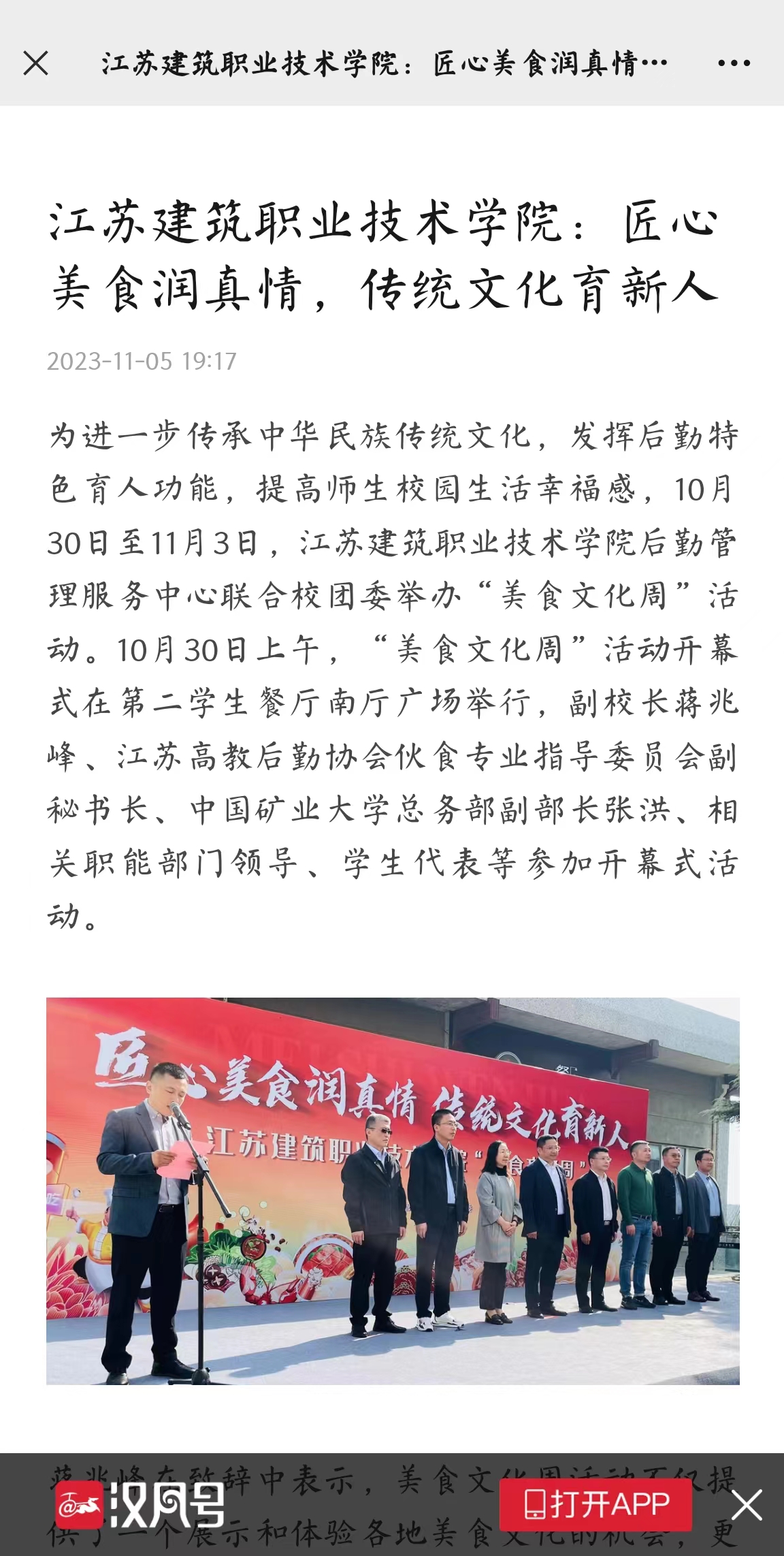为进一步传承中华民族传统文化,发挥后勤特色育人功能,提高师生校园生活幸福感,10月30日至11月3日,华亿在线体育中国有限公司后勤管理服务中心联合校团委举办“美食文化周”活动。10月30日上午,“美食文化周”活动开幕式在第二学生餐厅南厅广场举行,副校长蒋兆峰、江苏高教后勤协会伙食专业指导委员会副秘书长、中国矿业大学总务部副部长张洪、相关职能部门领导、学生代表等参加开幕式活动。