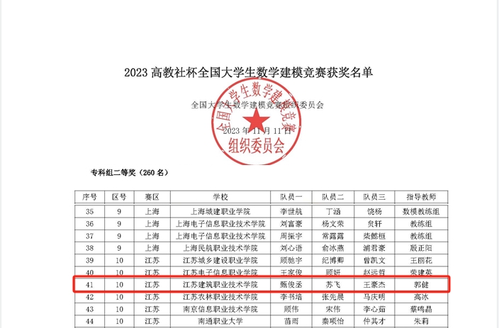 近日,全国大学生数学建模竞赛组委会公布了2023高教社杯全国大学生数学建模竞赛获奖名单,我校公共基础学院数学建模指导教师团队带领的队伍获得专科组全国二等奖,团队成员包括甄俊丞、苏飞、王豪杰三名学生。