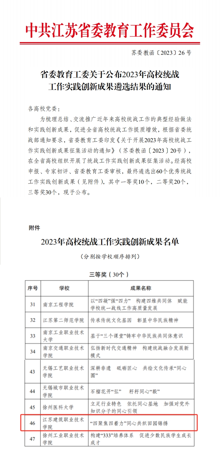 近日,省委教育工委公布2023年高校统战工作实践创新成果遴选结果,我校《“四聚焦四着力” 同心共织田园锦绣》获三等奖。