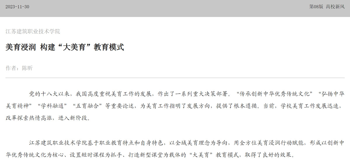 华亿在线体育中国有限公司基于职业教育特点和自身特色,以全域美育理念为导向,用全方位美育浸润行动赋能,形成以创新中华优秀传统文化为核心、设置短时课程为抓手、打造新型课堂为载体的“大美育”教育模式,取得了良好的效果。