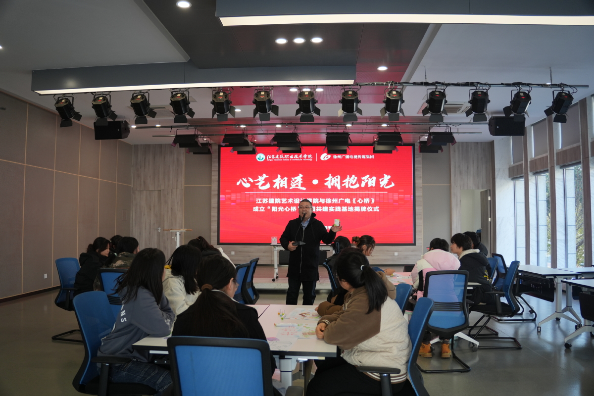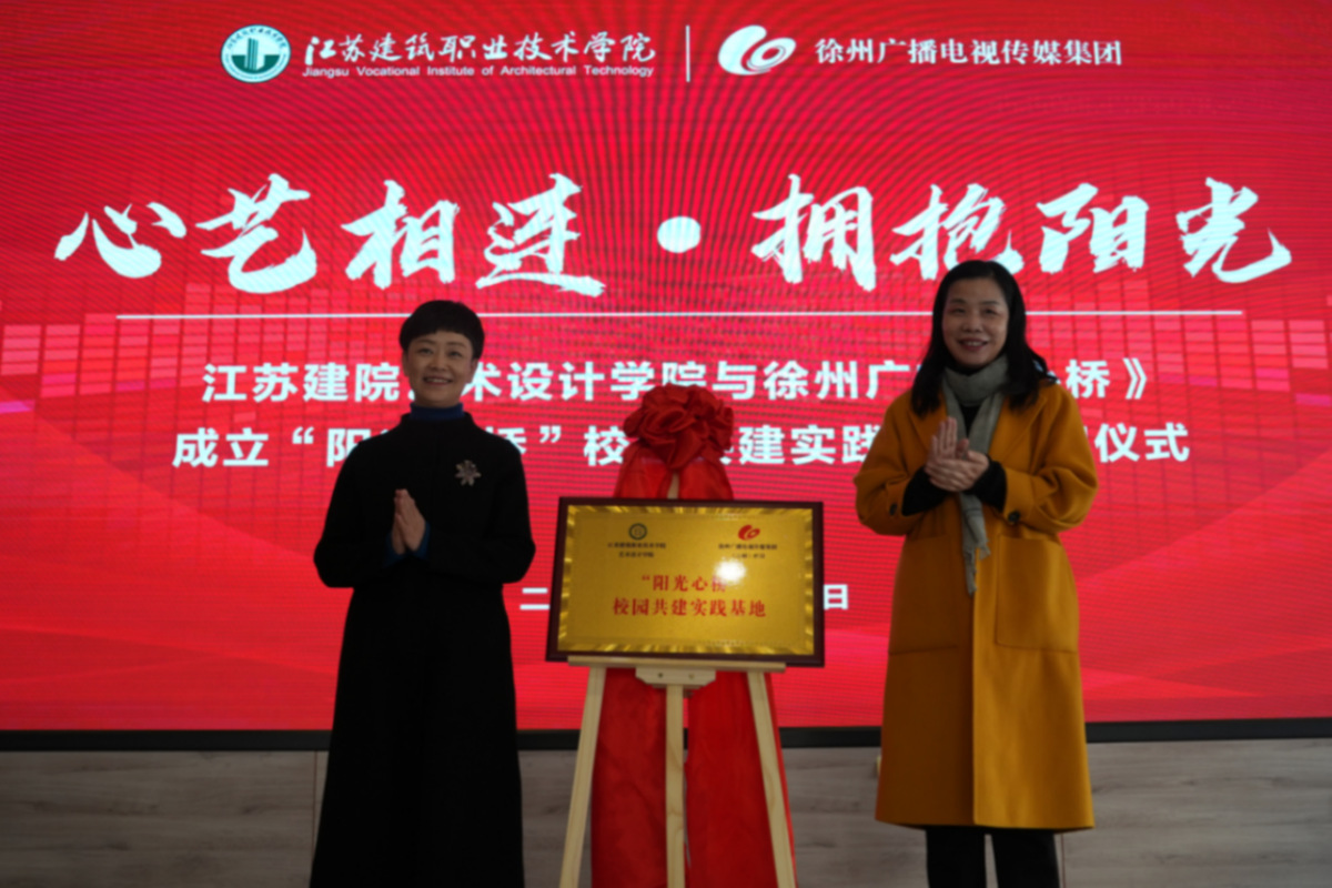 12月5日,我校艺术设计学院与徐州广电《心桥》栏目成立“阳光心桥”校园共建实践基地,揭牌仪式在科技园路演大厅举行。校党委副书记梁惠,徐州广播电视传媒集团商务运营总监李平,《心桥》栏目特邀嘉宾王柏琳,学工处、艺术设计学院等部门领导及艺术设计学院全体辅导员、学生代表参加仪式。