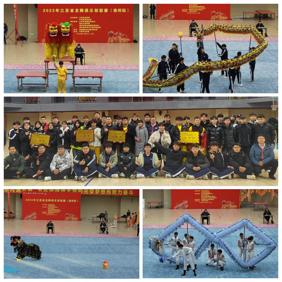 12月16日-17日,由江苏省体育局、江苏省体育总会主办,江苏省龙狮运动协会、徐州市舞龙舞狮运动协会承办的2023年江苏省龙狮俱乐部联赛(徐州站)比赛在徐州工程学院体育馆举行。我校龙狮队获成人组一等奖1项、二等奖1项,三等奖2项。