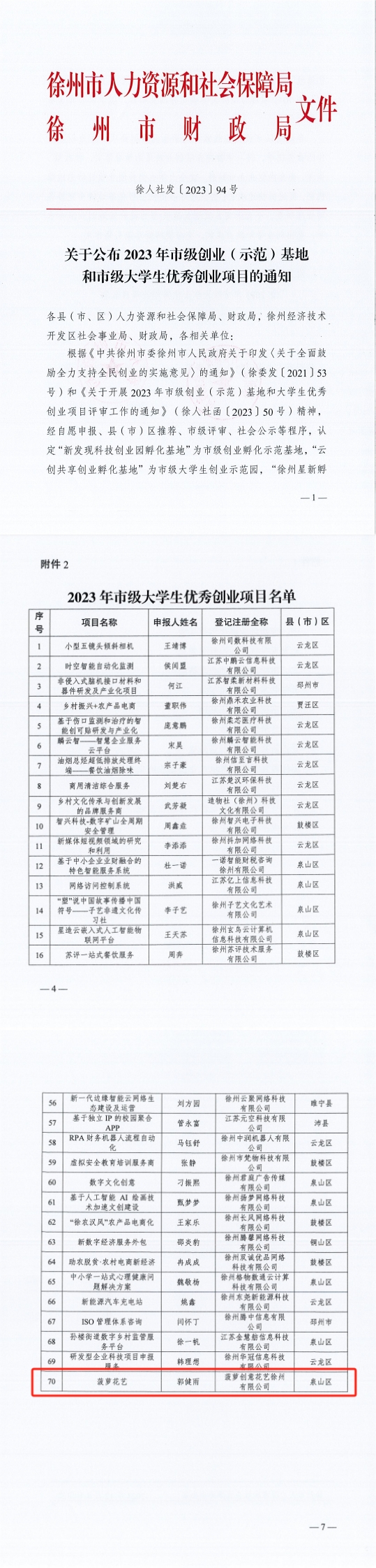 近日,徐州市人力资源和社会保障局发布了《关于公布2023年市级创业(示范)基地和市级大学生优秀创业项目的通知》,经企业申报、专家评审和现场考察等环节,我校大学生创业园项目《菠萝花艺》获2023年市级大学生优秀创业项目,并获得创业专项基金奖励3万元。
