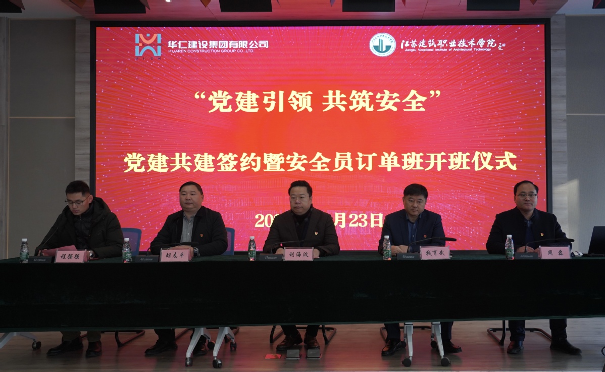 12月23日上午,我校和华仁建设集团有限公司在科技园路演大厅举行党建共建签约暨安全员订单班开班仪式。党委委员、副校长刘海波,华仁建设集团有限公司党支部副书记、工会主席钱育武,华仁建设集团有限公司副总经理胡志平,招生与就业处、建筑建造学院、企业相关部门负责人及安全员订单班全体师生参加会议。