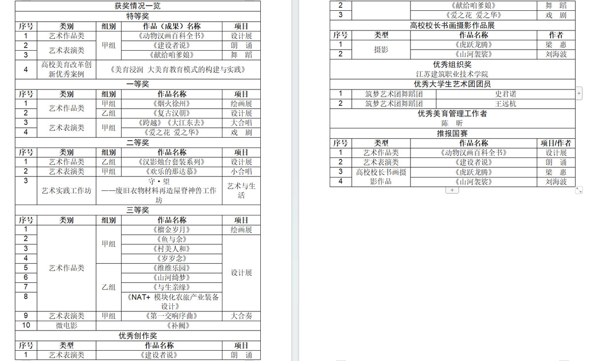 近日,省教育厅公布江苏省第七届大学生艺术展演活动获奖结果,我校参加了全部展演类别,并获特等奖4项、一等奖4项、二等奖3项、三等奖10项、优秀创作奖3项、校长书画摄影奖2项。同时,2名同学获优秀大学生艺术团团员、1名教师获优秀美育管理工作者,学校获优秀组织奖。其中,设计作品《动物汉画百科全书》(指导教师:陆曦)、朗诵节目《建设者说》(指导教师:陈昕)入围全国第七届大学生艺术展演。此届大学生艺术展我校的参展数量、获奖数量、获奖等次均创历史新高,获奖总数、特等奖获奖数、入围国赛学生作品数位居全省高职第一、全省前列。