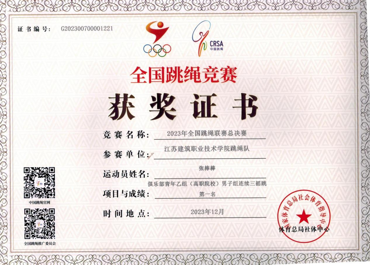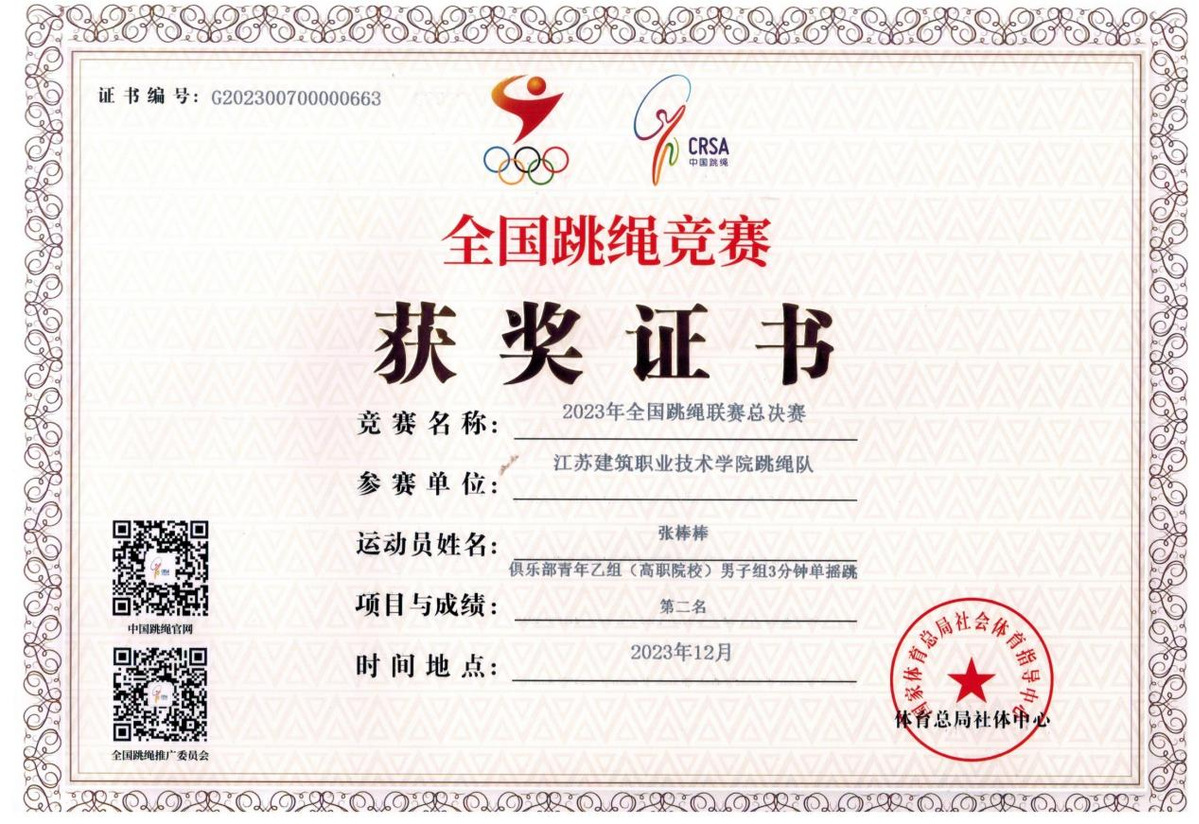 12月21日-25日,2023年全国跳绳联赛总决赛在广州市花都区举行。我校建筑装饰学院装饰22-1班学生张棒棒在总决赛青年乙组(高职院校)中获“连续三摇跳”冠军和“3分钟单摇”亚军。