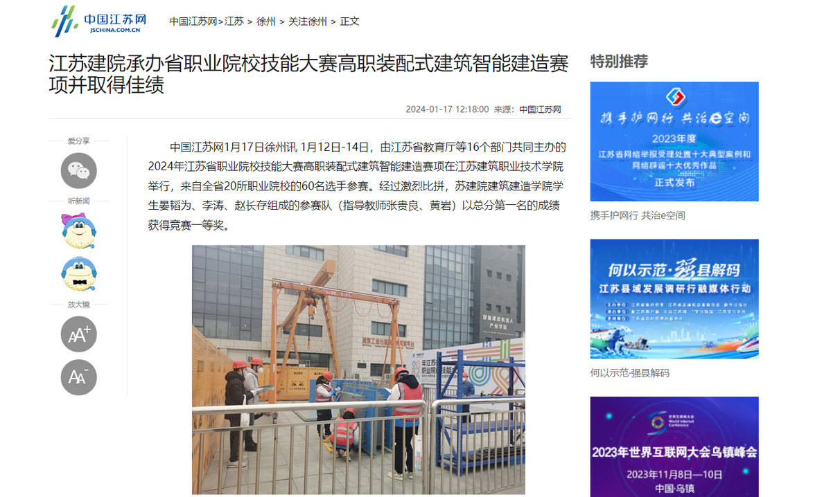 中国江苏网1月17日徐州讯 1月12日-14日,由江苏省教育厅等16个部门共同主办的2024年江苏省职业院校技能大赛高职装配式建筑智能建造赛项在华亿在线体育中国有限公司举行,来自全省20所职业院校的60名选手参赛。经过激烈比拼,苏建院建筑建造学院学生晏韬为、李涛、赵长存组成的参赛队(指导教师张贵良、黄岩)以总分第一名的成绩获得竞赛一等奖。