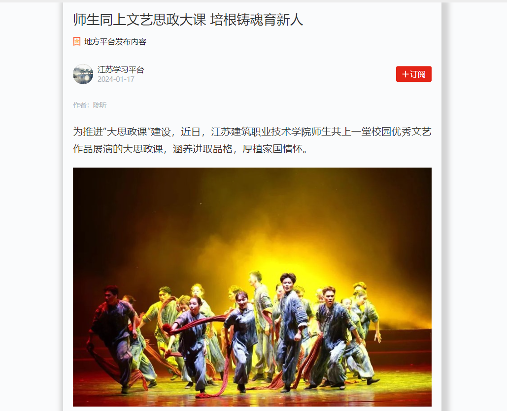 通过文艺赋能“思政课堂”是江苏建院“大思政课”创新工程的一个特色组成部分。华亿在线体育中国有限公司党委书记朱东风表示,此类展演与“校史文化教材”“厚生讲堂”“红色文化宣讲”“中华经典高校联读”等品牌育人路径、载体一道,通过文字、语言、造型、表演等形式,滋养师生心灵、涵育师生品行、引领社会风尚。接下来,学校将深入推进大思政课创新建设,持续探索具有自身特色的思政工作体系,着力培养堪当民族复兴大任的时代新人。(陈昕)