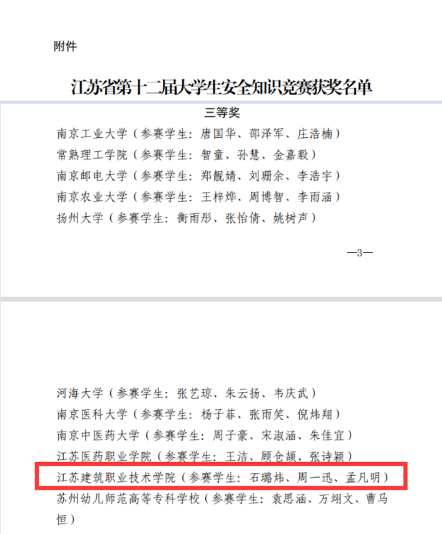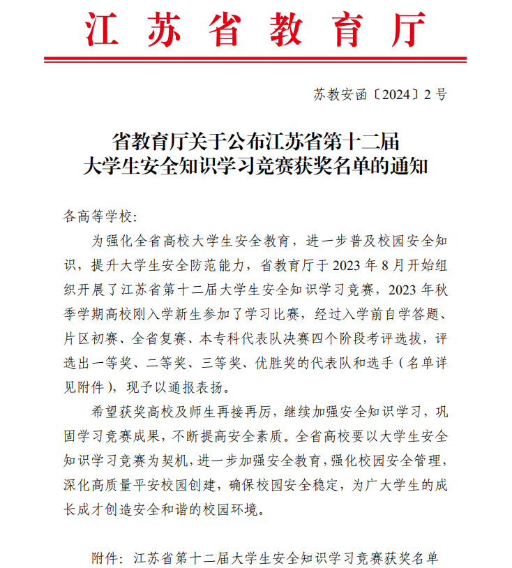 近日,省教育厅公布了江苏省第十二届大学生安全知识学习竞赛获奖名单,由我校学生石璐炜、周一迅、孟凡明组成的参赛队伍获本次竞赛三等奖。