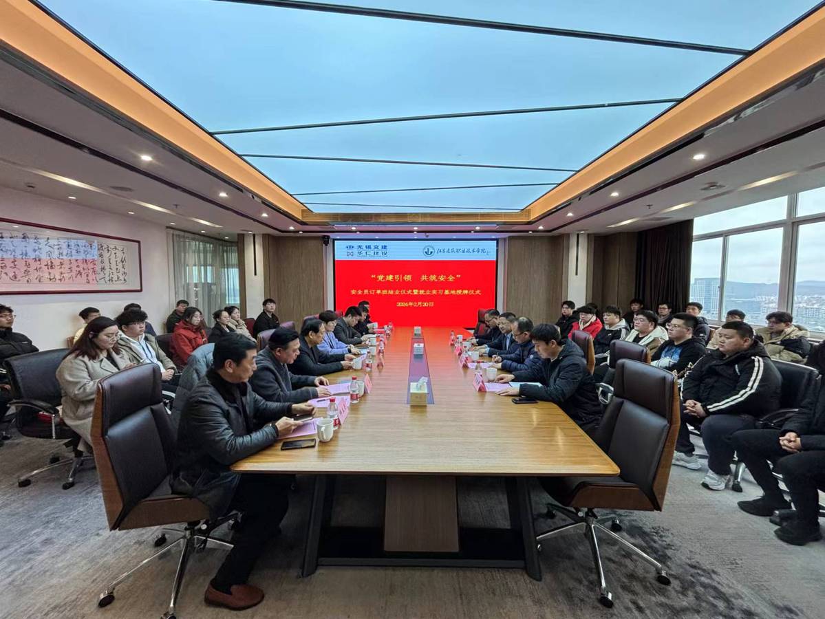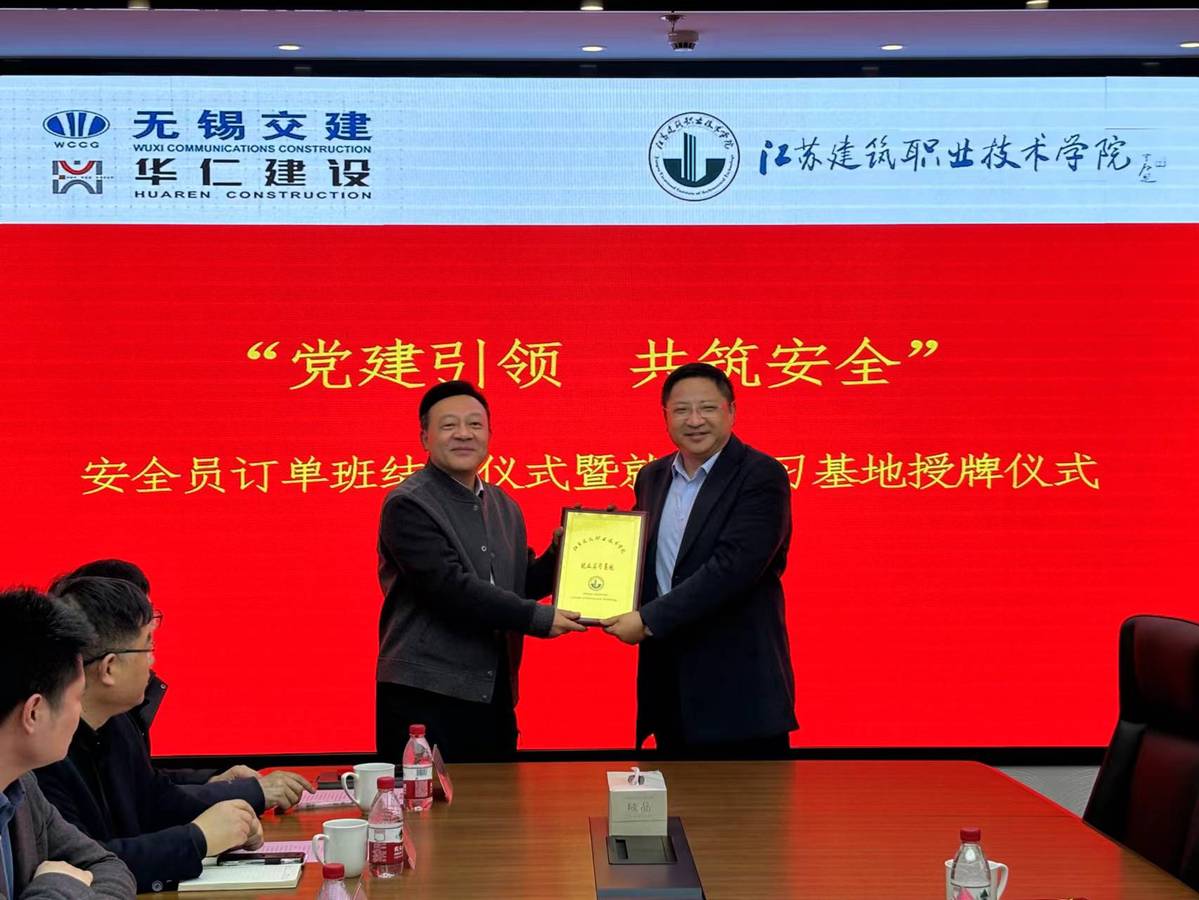 2月20日下午,校党委委员、副校长蒋兆峰带队走访华仁建设集团有限公司,参加“党建引领,共筑安全”安全员订单班结业典礼暨实习就业基地授牌仪式。无锡交建集团有限公司党委副书记、纪委书记、工会主席刘涛,华仁建设集团有限公司创始人、副董事长裴仁年及总经理祁敏接待蒋兆峰一行。招生就业处、建筑建造学院、企业有关部门负责人及订单班全体学员参加活动。祁敏主持活动。