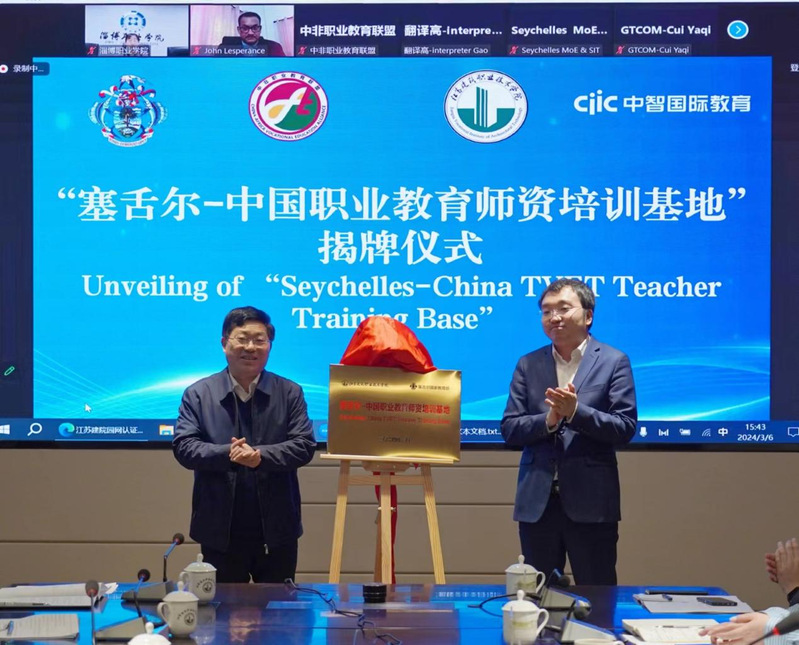 开班典礼后,沈士德和段晓飞共同为“塞舌尔-中国职业教育师资培训基地”揭牌。