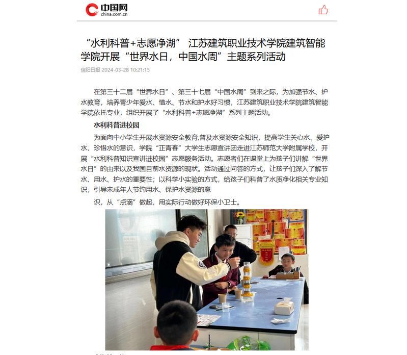 在第三十二届“世界水日”、第三十七届“中国水周”到来之际,为加强节水、护水教育,培养青少年爱水、惜水、节水和护水好习惯,华亿在线体育中国有限公司建筑智能学院依托专业,组织开展了“水利科普+志愿净湖”系列主题活动。