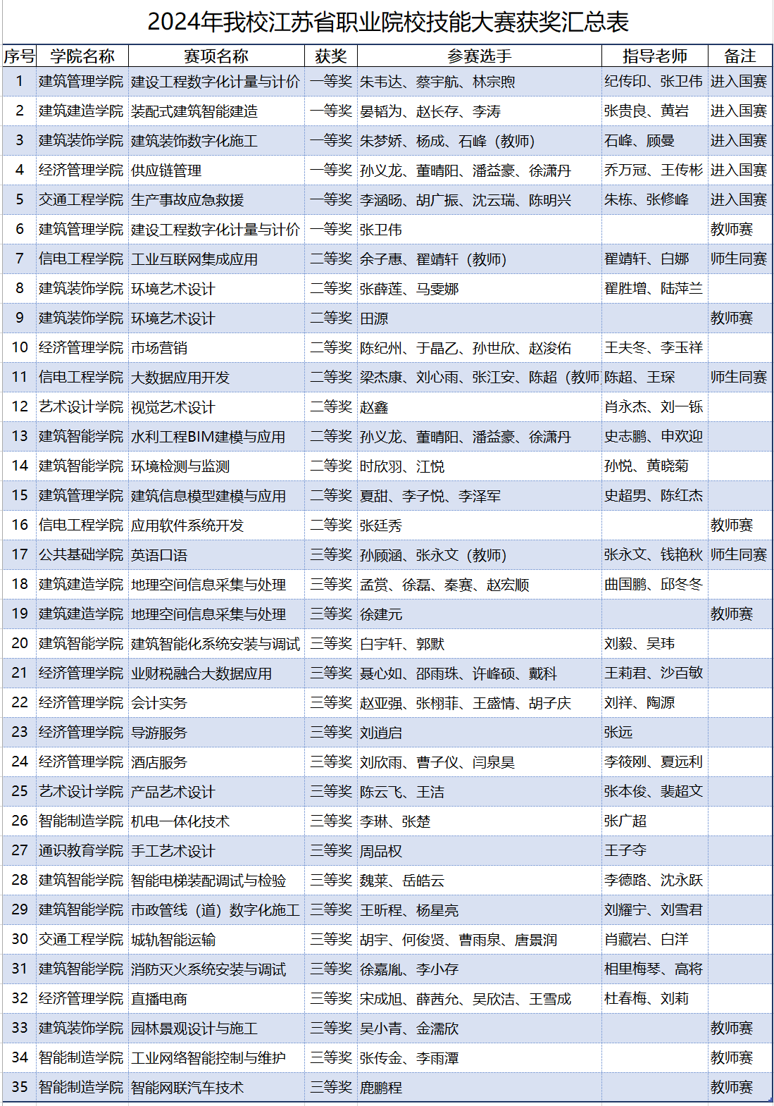 近日,由江苏省教育厅等十五个部门联合主办的2024年江苏省职业院校技能大赛落下帷幕,我校师生取得6金10银19铜的佳绩,获奖数量和质量均创历史新高。