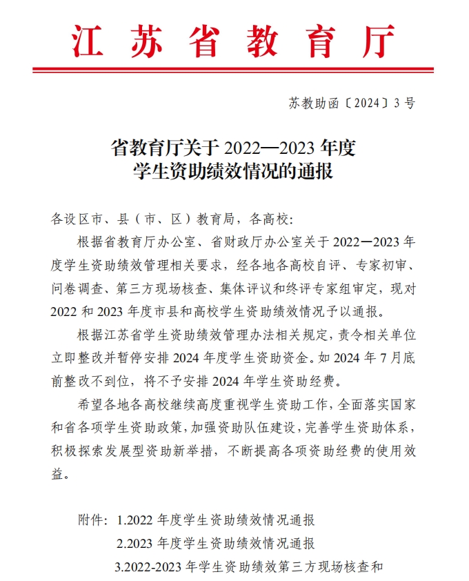 近日,江苏省财政厅、江苏省教育厅公布了2022、2023两个年度资助绩效考核评价结果(苏教助函〔2024〕3号),经各高校自评、专家初审、问卷调查、第三方现场核查、集体评议和终评专家组审定,最终我校在资助绩效考核评价中获得“优秀”等次,这是我校自2011年省教育厅实行学生资助工作绩效评价以来,连续13年获此殊荣。