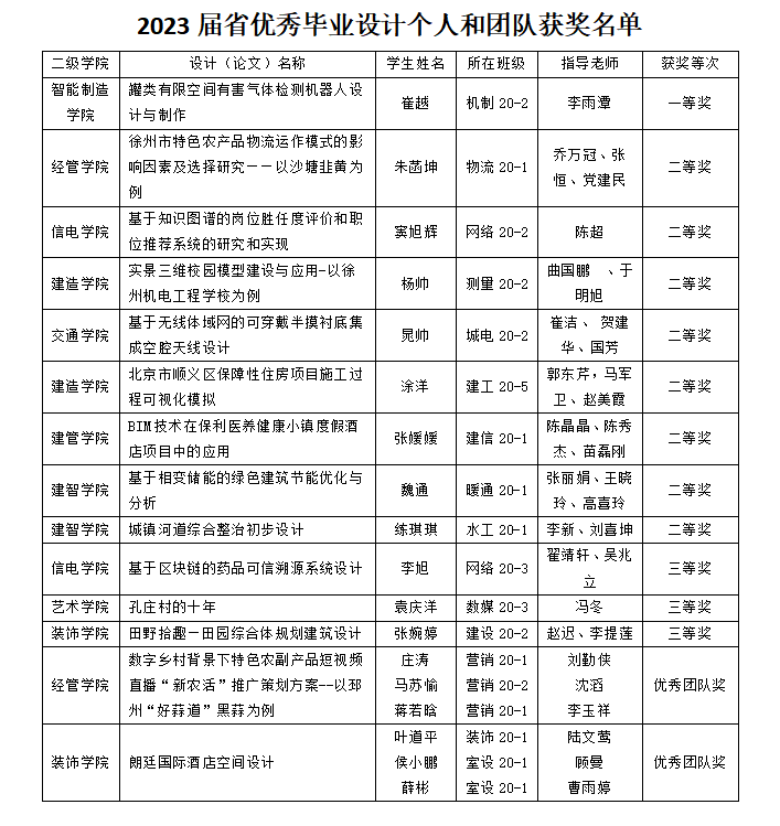 根据江苏省教育厅《关于公布2023年度普通高等学校优秀本专科毕业论文(设计)评选结果的通知》(苏教评函〔2024〕5号),我校获得优秀个人一等奖1项、二等奖8项、三等奖3项,优秀团队奖2项,获奖总数在同类院校中排名第二。