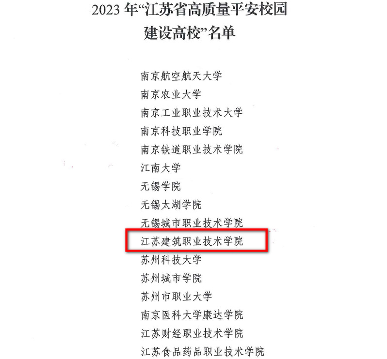 近日,江苏省教育厅、中共江苏省委政法委、江苏省公安厅联合印发《关于公布2023年省高质量平安校园建设单位名单的通知》,我校荣获“江苏省高质量平安校园建设高校”称号。