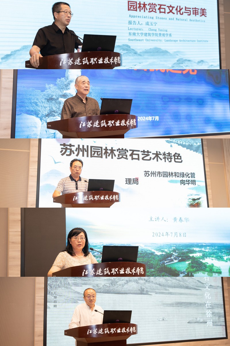 在随后的专家分享环节,五位来自不同领域的专家代表分别就园林赏石文化的多个方面进行了深入剖析与精彩分享。成玉宁以“园林赏石文化与审美”为主题,从赏石文化的历史流变、审美特征及种类文化等方面进行了全面阐述,为听众呈现了一幅丰富多彩的赏石艺术画卷。孙大亮则从石与人类的关系、江苏省观赏石资源分布概况及类型等方面入手,分享了自己对赏石文化的独特见解。向华明以“苏州园林赏石艺术特色”为题,深入解析了苏州园林赏石艺术的独特魅力与审美标准。黄春华聚焦“扬州叠石艺术”,分享了扬派叠石的研究成果、艺术概况及代表作品,展现了扬州园林叠石技艺的精湛与独特之处。吴玉伟则从徐州地区的赏石文化历史、观赏石资源分布及现代赏石文化推广等方面进行了分享,展现了徐州在赏石文化传承与发展方面的积极作为与显著成果。