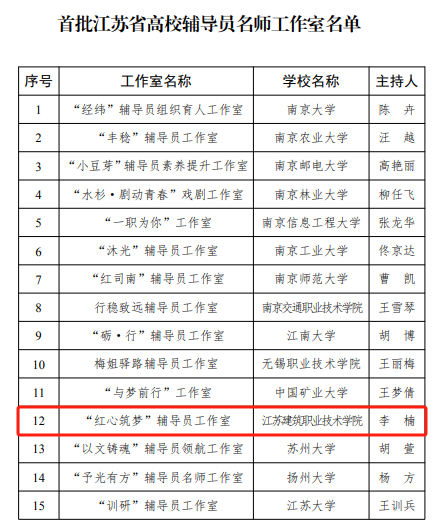 近日,江苏省教育厅公布了首批江苏省高校辅导员名师工作室立项建设名单,我校艺术设计学院党总支副书记李楠主持的“红心筑梦”辅导员工作室获批立项。