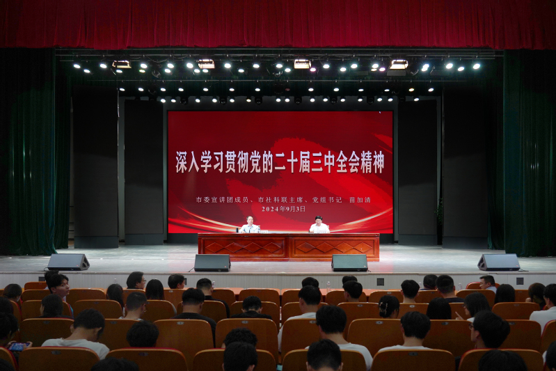 9月3日下午,我校在会堂举行学习贯彻党的二十届三中全会精神宣讲报告会,徐州市哲学社会科学联合会主席、党组书记、市社科院院长苗加清来校作报告。在徐校领导、全体教师及学生代表参加此次报告会。报告会由党委副书记、校长沈士德主持。