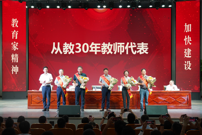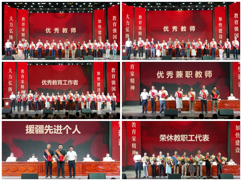 大会为本年度荣休的教职工代表颁发了纪念章,为从事教育工作满30周年的教职工代表颁发了纪念品,为援疆先进个人、2023-2024学年优秀教师、优秀教育工作者及优秀兼职教师颁发了荣誉证书。