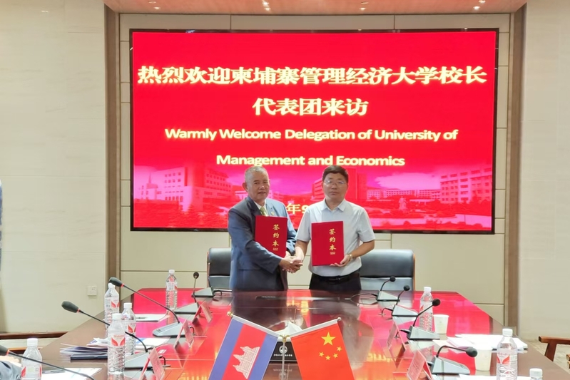 会上,沈士德代表学校对费克迪一行来访我校表示欢迎。他简要回顾了我校与柬埔寨管理经济大学长期合作所取得的成效,并介绍了我校在“职教出海”方面取得的成绩以及柬埔寨郑和学院建设的最新进展。刘海波则详细介绍了我校建设郑和学院的相关举措,以及我校在“中文+职业技能”人才培养方面的先进经验。