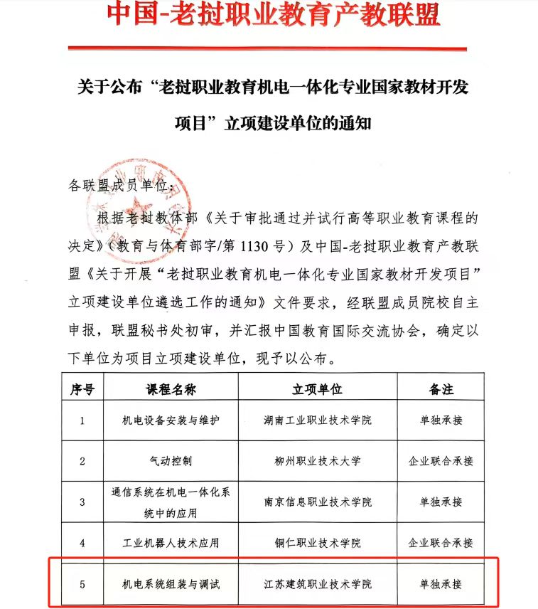 近日,我校智能制造学院专业课程《机电系统组装与调试》获批“老挝职业教育机电一体化专业国家教材开发项目”立项,我校将在未来正式负责该课程教材的开发建设等工作。