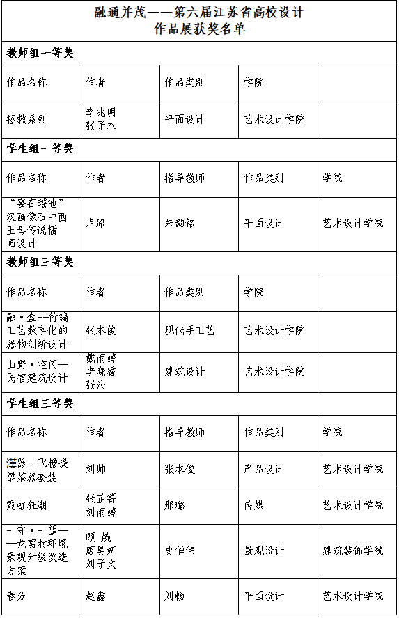 近日,江苏省教育厅公布“融通并茂——第六届江苏省高校设计作品展”获奖名单,我校作品获一等奖2项,三等奖6项,比赛成绩创新高。