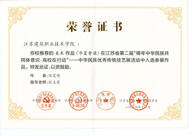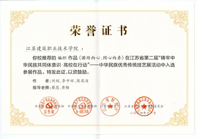 在中华民族优秀传统技艺展征集活动中,全省高校共征集887件作品,入选176件。我校美术作品《华夏脊梁》(作者:陈夏喻,指导教师:张志荣)、编织作品《团结向心、同心向齐》(作者:刘娟、李中辉、陈思洁,指导教师:蔡慧、黄梅)入选中华民族优秀传统技艺展参展作品。
