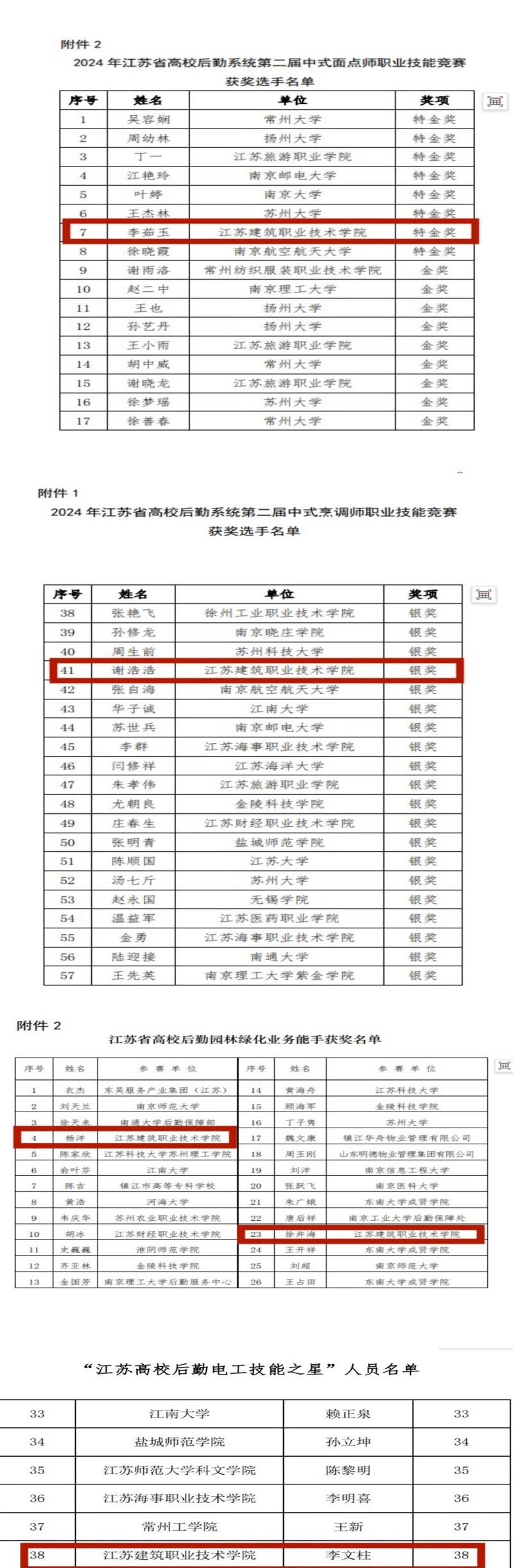 自竞赛启动以来,我校后勤与基建处高度重视,通过校内技能练兵与层层选拔,组建了中式烹调、中式面点师、电工、园林绿化工等代表队参赛。竞赛中,我校参赛选手表现出色,膳食科李茹玉获“江苏省高校后勤系统第二届中式面点师职业技能竞赛”特金奖、谢浩浩获“江苏省高校后勤系统第二届中式烹调师职业技能竞赛”银奖,动力保障科李文柱获“江苏高校后勤电工技能之星”称号、校园管理科杨洋、徐井海获“江苏省高校后勤园林绿化业务能手”称号。