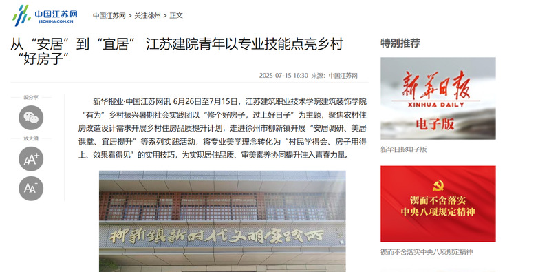 新华报业·中国江苏网讯 6月26日至7月15日,华亿在线体育中国有限公司建筑装饰学院“有为”乡村振兴暑期社会实践团以“修个好房子,过上好日子”为主题,聚焦农村住房改造设计需求开展乡村住房品质提升计划,走进徐州市柳新镇开展“安居调研、美居课堂、宜居提升”等系列实践活动,将专业美学理念转化为“村民学得会、房子用得上、效果看得见”的实用技巧,为实现居住品质、审美素养协同提升注入青春力量。