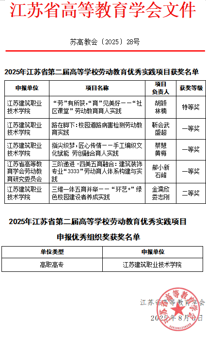 近日,江苏省高等教育学会公布了2025年江苏省第二届高等学校劳动教育优秀实践项目评选结果,我校获特等奖1项、一等奖3项、二等奖1项,并再次获“优秀组织奖”称号。